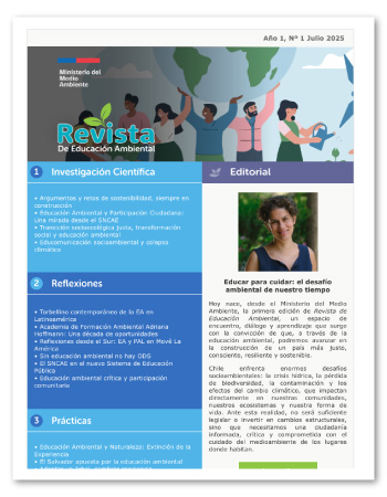La Revista Digital de Educación Ambiental del MMA, es un espacio de reflexión y difusión colaborativo, que busca generar instancias para difundir conceptos, valores y buenas prácticas de educación ambiental y participación ciudadana. Queremos que este sea un aporte de información relevante para acompañar el trabajo de educadoras, educadores y gestores ambientales preocupados del cuidado y protección del medio ambiente, de la enseñanza ambiental y la gestión ambiental local.